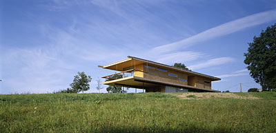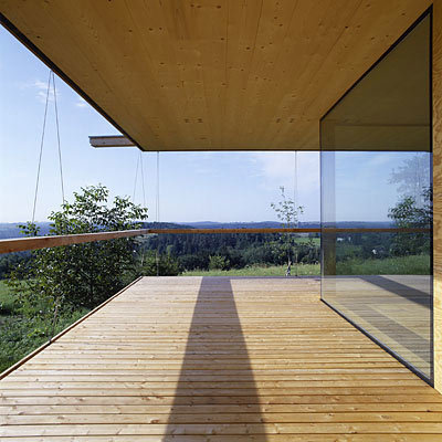 Das auf einer Hügelkuppe im burgenländischen Bockdorf (ein kleiner Ort südlich von Stegersbach) errichtete Ferienhaus thematisiert in seiner geradlinigen Struktur jenen dem Lebenskonzept von Städtern entsprechenden Bezug zur Landschaft, den man im weitesten Sinn als erhabenes Betrachtungsverhältnis (im Unterschied zum landwirtschaftlichen Arbeitsverhältnis) bezeichnen könnte.Nach langer Suche stießen die in Wien (haupt)ansässigen Bauherren hier per Zufall auf ein kostengünstiges, relativ großes Grundstück mit kleinem Baulandanteil, das nach der Hügelkuppe im Süden abfällt und den unverbaubaren Blick in die Weite sichert. Als Nutzland von geringem Wert, erwies es sich als idealer Standort für ein Haus mitten im Grünen: Direkt an der Baulandgrenze und in größtmöglicher Entfernung zur Straße schwebt das Gebäude mit nur punktuellem Bodenkontakt über dem sanft geschwungenen Terrain. Um aufwändige und kostspielige Fundierungsarbeiten zu vermeiden, ruht das gesamte Gebäude auf einem kleinen Betonfundament und acht Stahlstützen: diese leichtfüßige Geste scheint für ein Haus des temporären Aufenthalts angemessen, zumal der Baubestand der Umgebung in keiner Weise Anlass zur Bezugnahme auf eingesessene Strukturen bot. Die Einfachheit der zwischen umlaufend auskragender Dach- und Bodenplatte eingespannten Wohnräume hat mit der Fertigungs-Ökonomie im Holzbau zu tun (die von der Vorarlberger Firma Berlinger vorgefertigten Elemente wurden innerhalb von 14 Tagen – bei anhaltenden Regenfällen - auf der Baustelle zusammengefügt), andererseits kommen gerade in der konzeptionellen Strenge überraschende räumliche Qualitäten zum Vorschein.