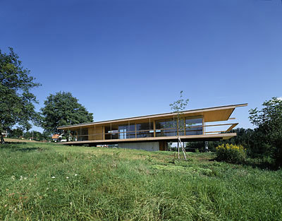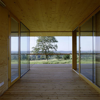 Die Offenheit eines Zwei-Personen-Haushalts wird durch keine Zwischenwände oder kleinteilige Einbauten verstellt, die Innenhaut der Wandpaneele aus Pappelsperrholz sorgt für eine helle räumliche Grundstimmung, und die Heizung liegt unter Lochgittern vor den Fensterflächen bündig im Industrieparkett. Ein besondere Raffinesse des Grundrisses: Die Gästewohnung mit eigener Nasszelle ist durch einen achsbreiten Zwischenraum von der Hauptwohnung abgesetzt, wobei der Durchgang zwischen den beiden Einheiten sowohl als offener Freiraum, als auch als ein durch große Schiebeflügel an der Nord- und Südseite abzuschließender und windgeschützter Innenraum genutzt werden kann. Die Laufschienen dieser Zwischenraum-Tore sind über einen Teil der Längsfront geführt, sodass sie auch als variabler Sicht- und Sonnenschutz verwendet werden können, wobei die auskragende Dachplatte ein im Sommer wohltuendes Grundmaß an Beschattung sichert. Die der Straße zugewandte Nordfront ist relativ geschlossen, sechs liegende und höhenversetzte Fensterfelder, drei davon in Überkopfhöhe, dosieren den Tageslichteinfall und den Blick nach draußen, während die vollverglaste Südseite in ganzer Länge freie Aussicht ins Grünland gewährt. Eine zwischen Drahtseilen eingespannte Reling (mit thekentauglichen Abmessungen) liegt als dritte Gerade in scheinbarer Schwerelosigkeit zwischen Dach- und Bodenplatte. Die Direktheit des Materialeinsatzes und der ungeschönte Pragmatismus des konstruktiven Aufbaus sind hier zur klaren Struktur gebunden, die der Landschaft einen bewohnbaren „Wahrnehmungsapparat“ einschreibt, ohne ihr selbst eine bestimmte Interpretation aufzuzwingen. (Text: Gabriele Kaiser, Langversion in „architektur aktuell“ 04, 2006)