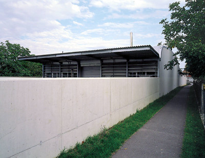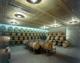 Die Temperaturstabilisierung der Räume erfolgt über im Grundwasser verlegte Zuluftleitungen. Die gesamte Südfront wurde raumhoch verglast. Die Beschattung erfolgt über bewegliche Alu-Lamellen, die das Licht in den 10 m tiefen Verkostungsraum umlenken. In die Südfassade „eingesetzte“ Rahmen aus Leimholz werden als Loggien genutzt und folgen dem Prinzip der Beschattung durch Lamellen.