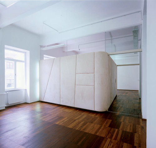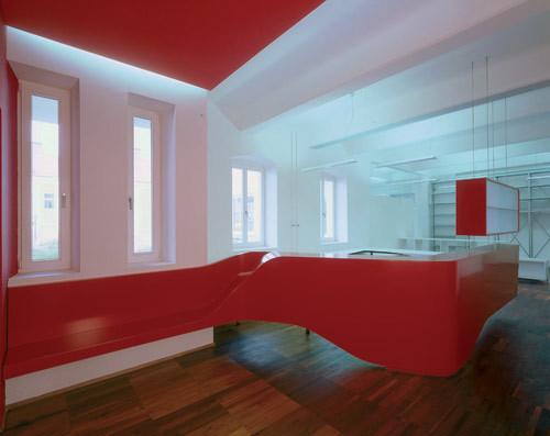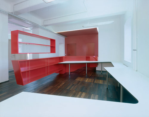 Um den Loftcharakter der 250 m² umfassenden Nutzfläche durch die Anforderung an zahlreichen kleineren Raumeinheiten nicht zu zerstören, sind alle neu eingezogenen Wände grundsätzlich nur 2,2 m hoch und schließen mit einer Fixverglasung an der Decke in 3,70 m Höhe ab. Vom neugestalteten Entree gelangt man direkt in den Empfangs- und Sekretariatsbereich, der mit allen Insignien der Repräsentation ausgestattet, sowohl farblich als auch formal am stärksten akzentuiert ist. Hinter der Mittelmauer befinden sich ein Besprechungszimmer, die Bibliothek sowie ein größeres Büro. Um in der Bibliothek ein konzentriertes ruhiges Arbeiten zu ermöglichen, sind die Außenwände dieser Raumeinheit gepolstert und damit vom angrenzenden Besprechungszimmer akustisch getrennt.