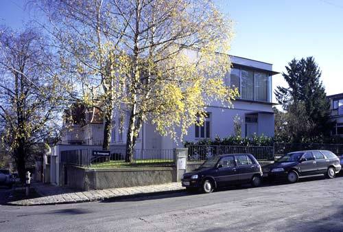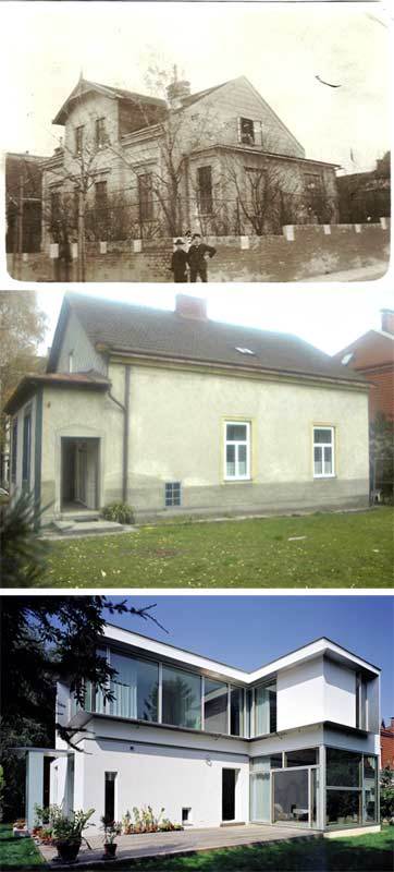 Das Beste aus zwei Welten, die Würde bzw. Noblesse des Altbaus mit der Funktionalität und Leichtigkeit eines Neubaus zu kombinieren, war Wunsch und Ziel. Vor allem an der eingeschossigen Gartenfassade, die keinen direkten Zugang ins Grüne bot, war Handlungsbedarf angezeigt, während die dreigeschossige Straßenfront im Sinne des alten Erscheinungsbildes nur komplettiert wurde. Der Dachstuhl wurde gartenseitig entfernt, und ein neuer Bauteil „landete“ auf dem Sockelgeschoss. Um diese Zusammenführung nachvollziehbar zu halten, sind alter und neuer Bauteil zueinander verschoben, durch eine zarte Fuge getrennt und mit unterschiedlichen Grauwerten versehen.
