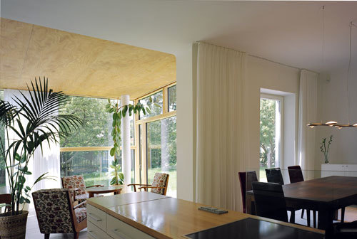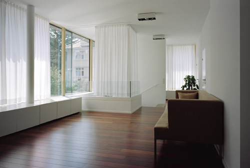 Der neue Baukörper bildet im Inneren einen neuen zentralen Erschließungsraum, der zu den renvierten klasischen Salons im Erdgeschoss einen erfrischenden Kontrapunkt setzt. Unten klassische Proportion, Parkett und Flügeltüren, oben familiäre, sonnendurchflutete Raumflucht, die verschiedene Funktionen ineinander fließen lässt. (Gekürzter Text der Architekten)