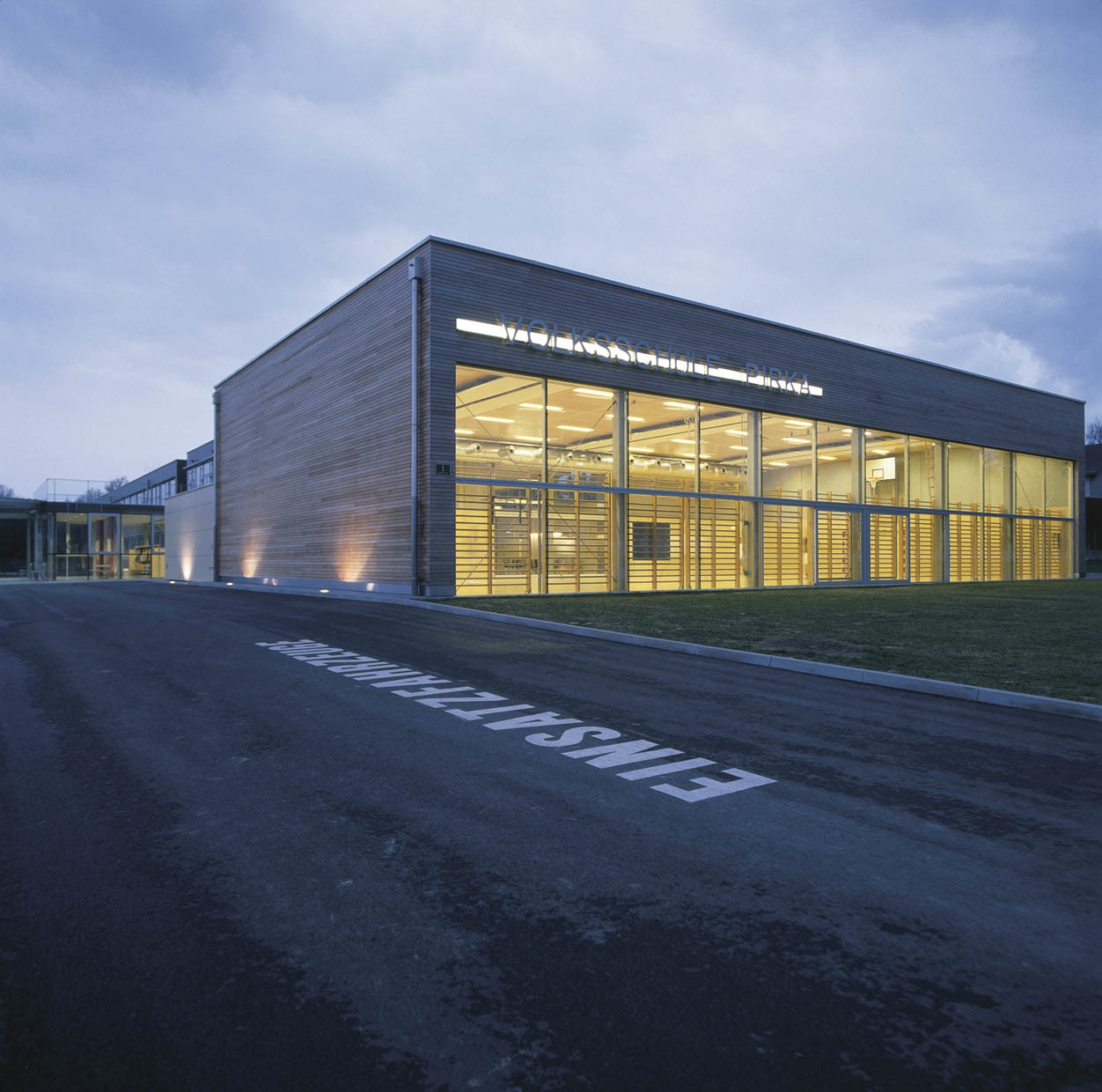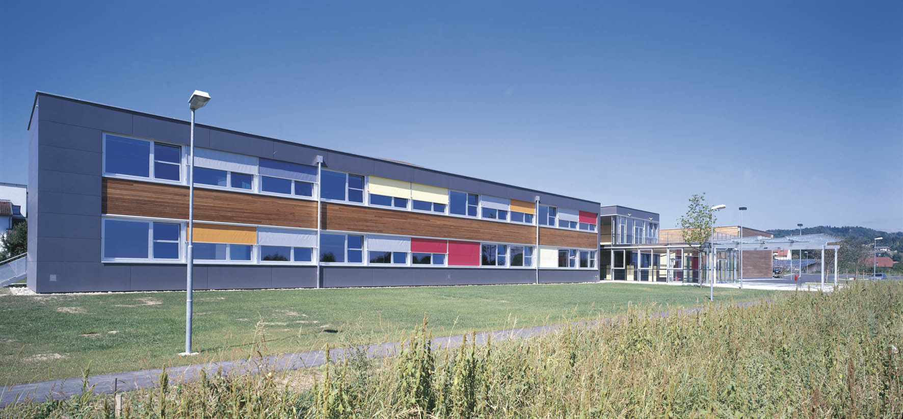 Der quergestellte Ost – Westflügel fügt sich stimmig in das Gesamtkonzept ein und ermöglicht eine schlüssige Verteilung der unterschiedlichen Funktionen: Nach Osten erstreckt sich der glasgedeckte Haupteingang, während sich im Westen der Seminarraum befindet. Nach Süden werden der Klassen- und Verwaltungstrakt erschlossen, den nördlichen Abschluss bildet der Turnsaal.