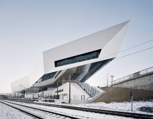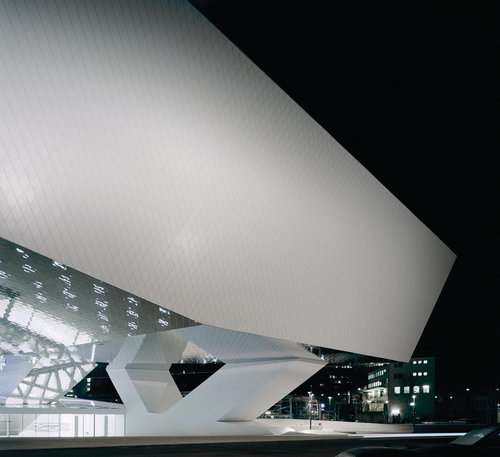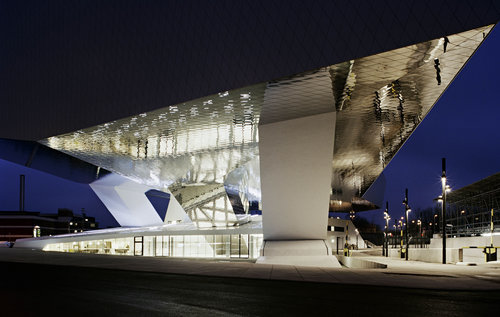 Das Porschemuseum ist als dynamisch geformter, monolithischer Baukörper konzipiert, scheinbar losgelöst über der gefalteten Topographie des Eingangsniveaus. Seine spiegelnde Untersicht nimmt die darunter liegenden Architekturlandschaft auf und potenziert atmosphärisch den Zwischenraum von Basis und Ausstellungsbereich. Auf anschauliche Weise verdeutlicht diese architektonische Geste jene Dualität von Erfahrung und Erfahrbarkeit, die dem baulichen Konzept zugrunde liegt. Der nach drei Seiten hin ausgerichteter Vorplatz verweist als offenes Zeichen des Ankommens und der Annäherung auf die funktionale Orientierung des Baus. Ähnlich der akzentuierten Frontfassade am Porscheplatz findet jede Gebäudeseite des asymmetrischen Korpus ihre städtebauliche Entsprechung. Zufahrtsstraßen und Bahnstränge führen an beiden durchgängig geschlossenen Gebäudeflanken vorbei. Eine zurückversetzte Verglasungsebene gewährt fragmentale Einblicke in den hochgelegenen Ausstellungsraum und bildet den rückwärtigen baulichen Abschluss.