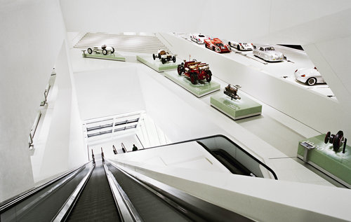 Der Ort des Zugangs offenbart sich als tiefster Punkt einer Spirale, die als Anordnungsparameter für das gesamte Raumvolumen steht. Hier eröffnet sich der „Kosmos Porsche“. Dem Besucher erschließt sich die Porschearena als sinnlich emotionale Kontaktaufnahme zur Automobilwelt, die sich in einem einzigen Kraftfeld entfaltet – wein Raum, der Erleben und die Kommunikation durch Nähe und Intensität vermittelt. Mäandrierend vernetzt durchziehen Ebenen und Wegesysteme das Ausstellungsvolumen und erschließen so dem Besucher eine Vielfalt sinnlicher und visueller Raumbezüge. Da die Spiralform selbst ihrem Wesen nach zunächst ein reines Wegesystem abbildet, wurden durch ihre Transformation Zonen differenzierter Funktionen geschaffen: Piazze und Straßen, Ausstellungsflächen und Wege unterschiedlichen Charakters. Im Sinne der von Offenheit geprägten Haltung des Unternehmens wird auf ein hierarchisches Ordnungsprinzip und das Aufzeigen einer linear vorgegebenen einzigen Zugangsweise verzichtet, sodass die räumliche Konzeption unterschiedliche Arten der Ausstellungsbetrachtung erlaubt. Die Wegeführung entlang der von Porsche vorgegebenen Produktgeschichte erfolgt chronologisch der Unternehmensgeschichte „vor 1948“ und „nach 1948“. Integrierte Themeninseln stellen inhaltliche Bezüge zwischen Automobilentwicklung und Rennfahrt dar. Zugleich steht es dem Besucher frei, sich die Ausstellung auf individuelle Weise anzueignen. Inhalte bleiben durchgehend klar ablesbar und in Sichtbeziehung mit dem bereits Erfahrenen. Zonen der Ruhe, der Beschleunigung im Wechselspiel von Enge und Weite steigern die spürbare Spannkraft dieser Raumerfahrung. Ein Galeriebereich am Ende der Ausstellungsabfolge entwickelte sich aus der Verbindung des architektonischen mit dem Ausstellungskonzept von HG Merz. Die resultierende Entflechtung von Zugangs- und Austrittsbereich verleiht der Gesamtinszenierung zusätzliche Spannung. Fließender Raumbezüge in visueller und funktionaler Hinsicht prägten die Entwurfsmethodik, welche die Architekten in der Gesamtheit des Museumsbaus verfolgten.