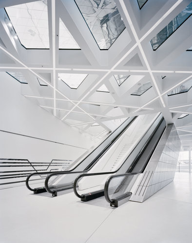 Die Reise in die Welt von Porsche nimmt unterhalb des losgelösten Elements ihren Anfang. Über eine sanft abfallende Rampe werden die Besucher in das Gebäudeinnere geleitet. Die Verjüngung des Vorplatzes und die abnehmende Raumhöhe in Richtung Eingang bilden Teil jener Dramaturgie, die Besucher, Nutzer des Museums durchgehend begleiten. Das Foyer weitet sich – flankiert von Restaurant und Museumsshop – in Richtung Empfang, Kaffeebar und Klassik-Werkstatt aus. Die „Erfahrung Porsche“ findet im Classic-Workshop, im einsehbaren Archivbereich, der galerieartig das zweigeschossige Raumvolumen der Basis umgibt, ihre Entsprechung: jenen Bereichen, in denen aktiv und sichtbar am Produkt gearbeitet wird. Der einzige Einritt in den eigentlichen Ausstellungsbereich erfolgt über einen prägnanten, zentral gelegenen Treppenstrang. Die Geometrie des Aufstiegs bildet Teil der architektonischen Inszenierung: erneut verengt sich die Wegeführung, ehe diese sich bei Eintritt in den Ausstellungsbereich in einen Raumkörper von beeindruckender Dimension transformiert.