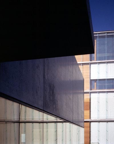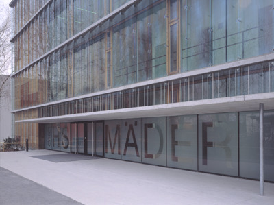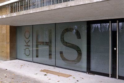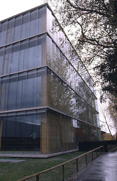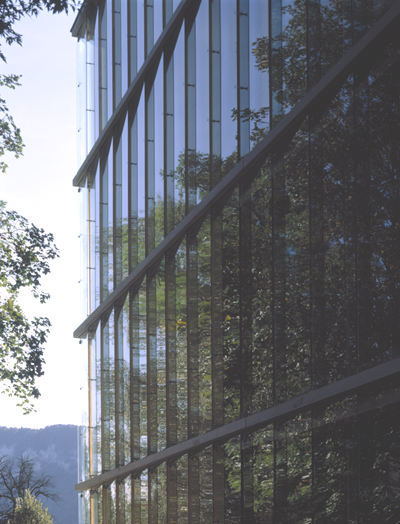 Durch die je nach Sonnenstand wechselnden Zustände von Transparenz ändert sich die Erscheinung des Baukörpers: von seiner Entmaterialisierung im Streiflicht bis hin zum Spiegel der Umgebung. Die weitgehende Verglasung der Fassaden ermöglicht zusammen mit einem zentralen Lichtschacht und Oberlichtbändern in den Kastenwänden aus Holz eine natürliche Durchbelichtung der Geschoße, trotz ihrer Grundfläche von 27 mal 27 Metern.