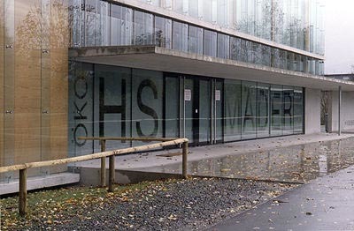 Das über Niveau viergeschoßige Schulhaus wie auch die flache, weil zu einem Drittel ins Erdreich abgesenkte Doppelturnhalle sind kompakte Baukörper mit einem möglichst geringen Flächen- und Energieverbrauch. Der Entwurf orientiert sich an den engen Zusammenhängen zwischen Form, Funktion, Ökonomie und Ökologie. Die rundum zweischichtige Fassade des Schulhauses besteht aus einer Holz - Glas - Konstruktion, die von einem hinterlüfteten Mantel aus geschuppten Glaslamellen umhüllt wird.