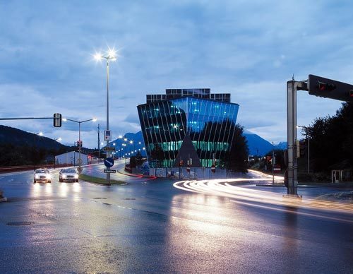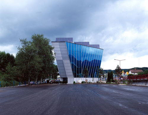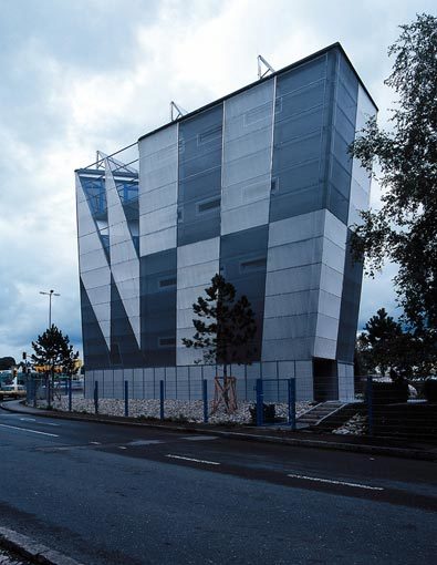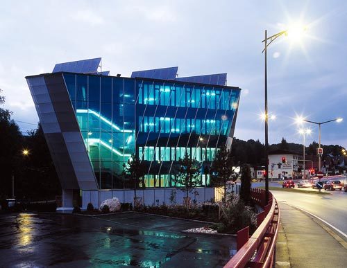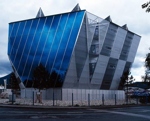 Von außen wirkt das Gebäude durch die glatte, bläulich glänzende Oberfläche präzise und hochwertig, jeder Blinkwinkel bietet neue, überraschende Perspektiven. Für Nutzer und Betrachter hat das Gebäude hohen Erlebnis-Charakter im öffentlichen Raum.