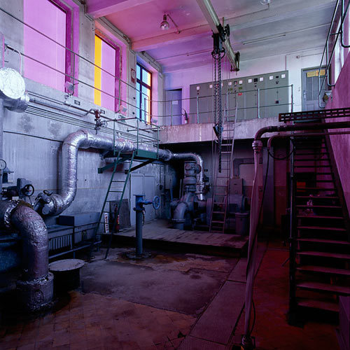Zwei Pumphallen werden von einem Zwischentrakt verbunden, der ursprünglich als Brückenbauwerk auf Stützen ausgeführt war und mittlerweile zu Lagerflächen geschlossen wurde. Satinierte Verglasungen weisen nun auf seine frühere Erscheinung hin. Im Obergeschoss ist eine Wohnung mit kleinen Fensteröffnungen untergebracht. Diesen sind jetzt Glasscheiben vorgesetzt, welche die Strasse für die Bewohner weiter weg rücken lassen und die drei Trakte mit einem Band aus farbigen Gläsern überziehen. Die Höhe ist an die großen Fenster der Maschinenhallen angeglichen.