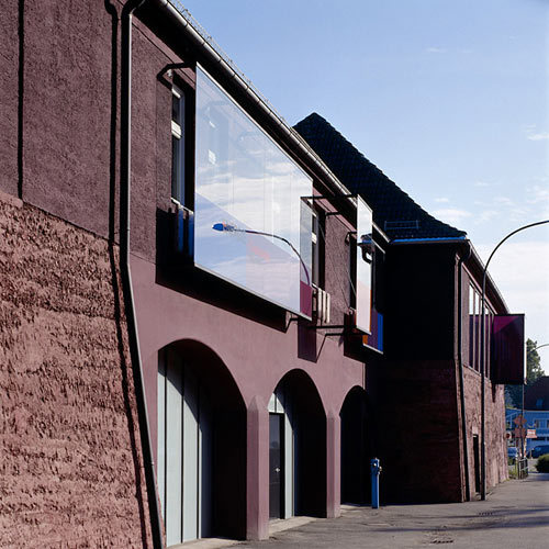 Die beiden mächtigen Sockel aus Stampfbeton wurden vom Verputz freigelegt, um die Gliederung des Gebäudes lesbar zu machen. Sie sind wasserabweisend lasiert, im gleichen Farbton wie die sanierten Putzflächen des Hauses: Weinrot ist eine Anpassung an die Farbe des Daches, es ist vor allem aber eine unaufdringliche und doch besondere Hintergrundfarbe für das abstrakte Band aus Gläsern und trägt zur eleganten Präsenz des Gebäudes bei. (Text: Architekt)