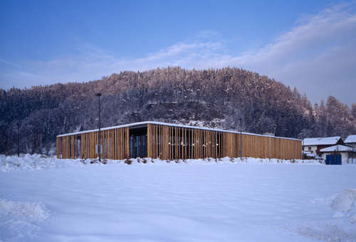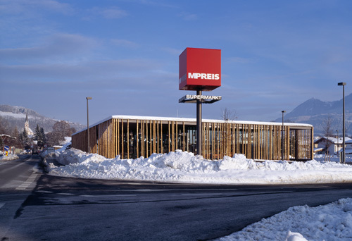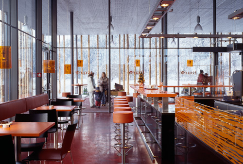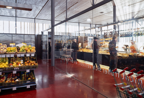 Durch die bis zum Randverbund im Boden eingelassenen Verglasungen wird eine optische Durchgängigkeit der Kunstharzbeschichtung des Gebäudesockels vom Markt zu den Vorbereichen erreicht – der Übergang zwischen Innen und Außen ist fließend. Die abgehängten Hallenreflektoren mit indirekter Deckenaufhellung und die Wechselwirkung der eingesetzten Farbtöne – die Grautöne der Sichtbetonwände, der Decke und der Eisenglimmerbeschichtung der Stahlkonstruktion bzw. die warmen Rot- und Gelbtönen der Bodenbeschichtung, der Möblierung und der vorgestellten Fichtenstämme – lassen eine großzügige, helle Marktatmosphäre entstehen. (Text: Claudia Wedekind nach einem Text der Architekten)