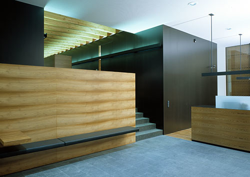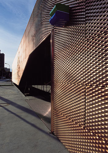 Die innere Atmosphäre ist offen und zugleich eindeutig verortet. Man spürt auch ohne Beschriftungen, wo man ist, wo man hingehört, wie man hier versorgt wird. Die Stimmung ist geprägt durch die kompakte Möblierung in Akazienholz, die dunklen Trennwände, durch helle Decken und Böden, durch indirekte Lichtführungen über die Dachkonstruktion und präzise verteilte Blickachsen. Außen dominiert die homogene Gebäudehülle aus Bronze-Streckmetall: ein fein gelochter Schleier, der einerseits Assoziationen zum industriellen Bauen, zum harten optischen Klang der Stadtperipherie anspricht, andererseits mit dem dunkelgoldenen Metallglanz auch das Flair einer kostbar eingekleideten Schatztruhe andeutet. Die suggestive Kraft dieser sachlich/noblen, gitterartigen Außenhaut hat sogar noch tiefere Bedeutungsschichten, denn sie wirkt ebenso anregend „ambivalent“ wie etwa die fein gerasterten Balkon- und Erkerfenster altorientalischer Stadthäuser; im „heiligen Land“ Tirol fanden und finden sich vergleichbar dosiert kommunikative Membranen im Inneren der Beichtstühle – und das wäre für eine Bank und das intime Kreditgeschäft ja nicht die abwegigste psychologische Analogie.