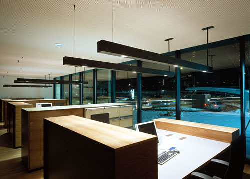 Die neue Filiale „Olympisches Dorf“ bringt all diese Aspekte in eine Form, die dem an sich wenig kommunikativen Umraum positive Dimensionen hinzufügt. Übersichtlich und bequem führt eine Abfahrt von der Straße weg, taucht an der Gebäuderückseite halb unter das Niveau, mündet in den unters Haus eingeschobenen Parkplatz. Man steigt wettergeschützt aus, bleibt aber mit der Straße und dem Außenraum optisch in enger Verbindung, da der Bau hier leicht aus dem Terrain herausgehoben ist, über den Stellplätzen „schwebt“ und nach drei Seiten Licht- und Sichtschlitze freilässt. Ein paar Stufen schließen die Schleife der Annäherung, leiten vom Auto hinauf zum Kundeneingang, der mit breitem Vorplatz direkt zur Straße blickt. Von da eröffnet sich schwellenlos eine helle Kundenhalle. Ein schlanker „Tresen“ dient als Anlaufstelle, verteilt die Wege weiter nach den Seiten: rechts ebenerdig zu einem Besprechungsraum und zur Selbstbedienungszone, links einige Stufen hinauf zu dem über den Carport auskragenden Bauteil – mit den individuellen Kundenräumen und dem Sekretariat, das mit breiter Verglasung die westseitige Stirnfront des Hauses einnimmt.