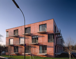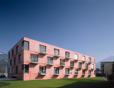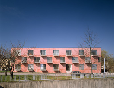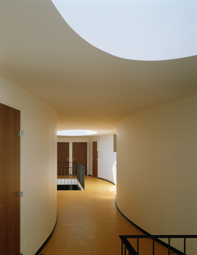 Erschlossen wird das Gebäude durch eine lange Rampe, neben der Kellerersatzräume liegen, weil das Tiefgeschoss einen gedeckten Parkplatz enthält. In einem überraschenden Kontrast zum kargen Aussenbild sind die inneren Erschließungsbereiche gestaltet, um die sich Kleinbwohnungen mit jeweils zwei Zimmern in U-Form legen. Die einfache Typologie wird gesteigert durch die wellenförmigen Wände der Verkehrsflächen, die Individualität und Privatheit vermitteln. Um diese von oben belichtete Zone sind die Küchen und Bäder der Wohnungen ringförmig angeordnet. Innenräumlich zeigt das Haus, dass es mehr als ein Gerät ist. (Text: Wolfgang Jean Stock, 09.07.2001)