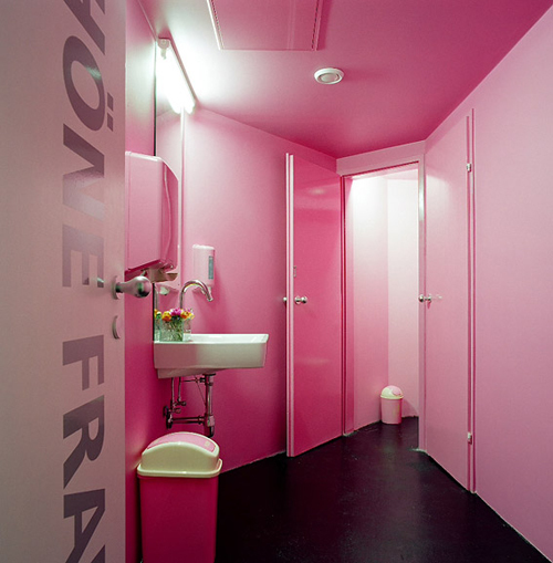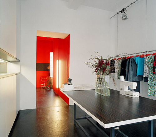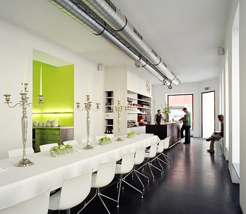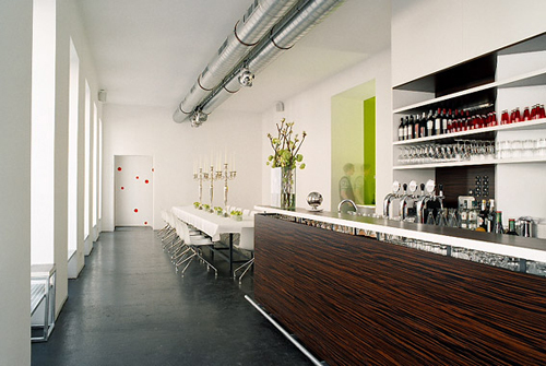 Eine strenge Komposition des Raumes ist Ausgangspunkt für ihre Bühne der barocken Lebensfreude. Und für jeden der drei Freunde gibt es eine färbige Raumtasche. Diese diskreten aber doch präsenten Erweiterungen für Kochen, Waschen und Umkleiden unterstützen den chic urbanen Gastraum. (Text: Architekten)