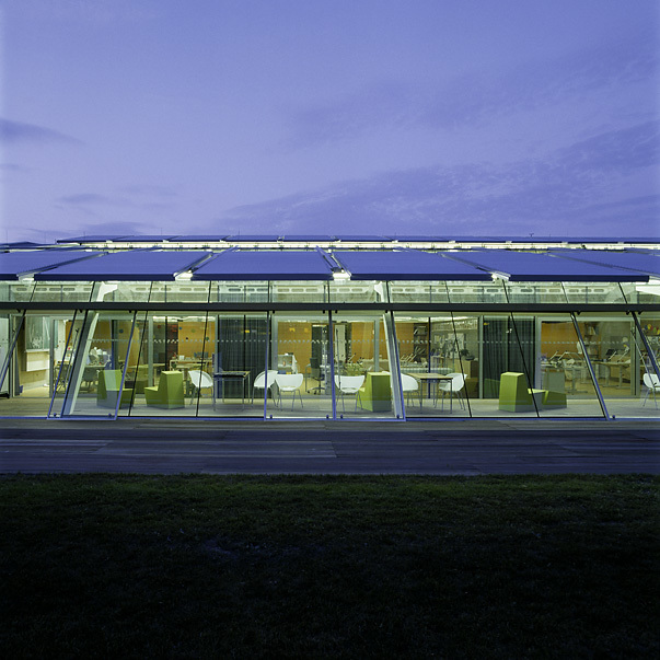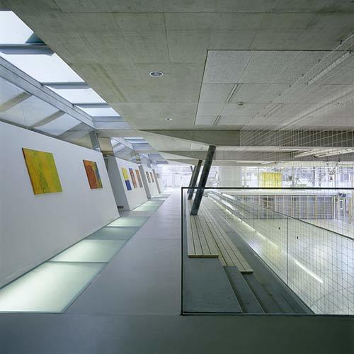 „fasch&fuchs.“ arbeiten strukturell. Alle erdberührenden Teile sind in Ortbeton ausgeführt, ebenso die Decke über dem Erdgeschoß. Die Aufbauten sind leichte Stahltragkonstruktionen, die wie bei ihrem Entwurf für das Kindermuseum in Graz durch konstruktiv wirksame Mehrschichtplatten in Holz ausgesteift sind. Decken und Wände aus Beton bleiben sichtbar. Das verleiht dem Bau eine gewisse Rauheit, doch wer genau schaut, kann erkennen, mit welcher Präzision einfachste Akustikplatten in die Ausnehmungen des Sichtbetons eingelassen sind. Wenn nichts verkleidet, nichts „beschönigt“ wird, so zeigt dies die Affinität der Architekten zum industriellen Bauen und drückt aus, was Lernen ist: Arbeit.