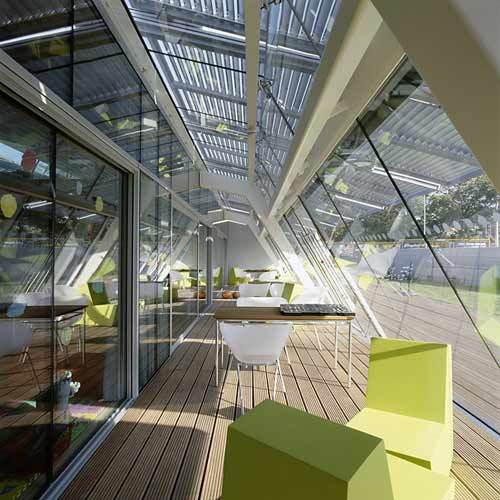 Atmosphärische Wärme in den Arbeitsräumen des Unterrichts wird durch die helle Holzuntersicht der Decken und Holzböden erzeugt, durch farbige Gläser zur Garderobe und durch verschiedenfarbig tapezierte Polstermöbel, mit denen die Rückzugszonen der Klassen, die in der Gruppenarbeit mit Behinderten unverzichtbar sind, möbliert wurden. Der Luxus optimierter Arbeitsbedingungen liegt in den Wintergärten und Terrassen, die jedem Raum mit Südorientierung vorgelagert sind. Entwickelt seinerzeit aus der Forderung nach Niedrigenergiestandard, sind sie nun Rückzugsort und Abwechslung und kommen dem Bewegungsdrang behinderter Kinder entgegen.