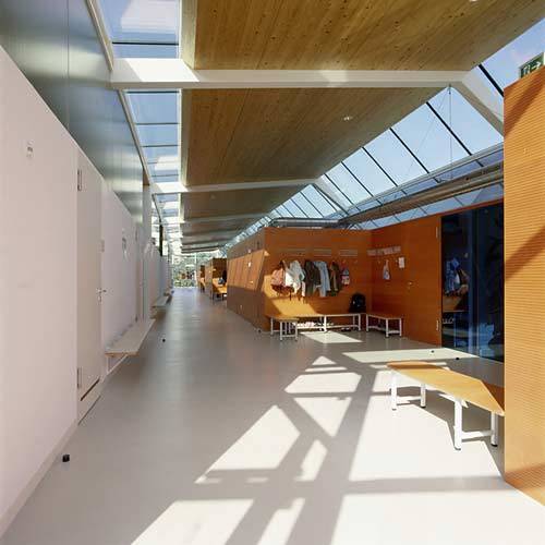 Die Entscheidung, den Turnsaal visuell und akustisch eng mit dem schulischen Tagesablauf zu verknüpfen, war gewagt, weil weder die Lärmentwicklung noch die Reaktion der Schüler voraussehbar war. Die Architekten haben jedoch durch eine klare Zonierung unterschiedlicher Bereiche dafür gesorgt, dass eine Beeinträchtigung von Räumen mit intensiver Lerntätigkeit vermieden wird. Eine Mittelzone mit Sanitär- und Nebenräumen, die über die darüberliegende Terrasse belichtet wird, wirkt als Puffer zwischen der stark frequentierten Pausenhalle und den Klassen.