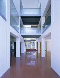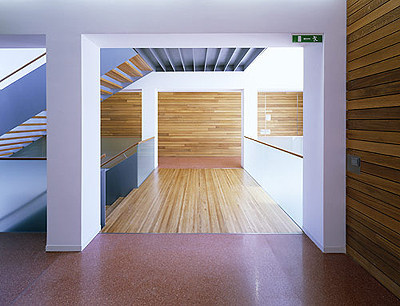 Das neue Gemeindeamt im alten, säuberlich vernähten baulichen Mantel signalisiert Offenheit und Transparenz: Die bestehende Zweiteilung des Bauvolumens mit dem durchfließenden Bach blieb erhalten, der Vorderbau jedoch öffnet sich mit seiner verglasten Bürgerservicezone und der markanten Eckpassage Richtung Vorplatz. Unter der querliegenden dreigeschossigen Halle fließt der Mühlebach, dessen Verlauf im gesamten Gebäude sichtbar und spürbar ist. Diese lichtdurchflutete Treppenhalle sorgt im Kern des Gebäudes für eine unvermutete räumliche Weite und erschließt auch den rückwärtigen Bauteil mit Büros, Sitzungszimmer im Ober- und einem geräumigen Seminar- und Vortragsraum im Dachgeschoss.