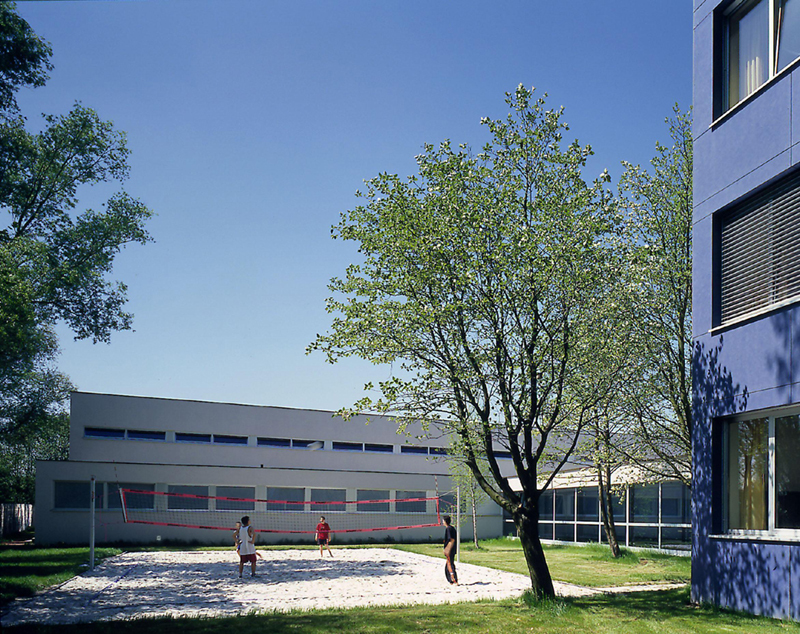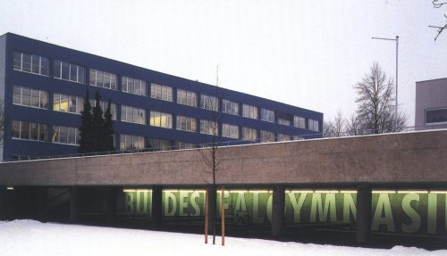 Die Eingangssituation wurde durch das Aufschneiden des mit grossem Schriftzug überzogenen Sockelbauwerks betont, während der H-förmige Grundriss des Hauses mit den beiden einhüftigen Klassentrakten unverändert erhalten blieb; durch die Vertiefung des Quertraktes konnten zusätzliche Klassen im Erdgeschoss und ein Musiksaal im obersten Geschoß gewonnen werden. Eine dadurch ermöglichte und im Wettbewerb gar nicht vorgesehene zweigeschoßige Halle gehört zu den augenscheinlichsten, für alle möglichen Nutzungen offenen Freiräumen des Gymnasiums.
