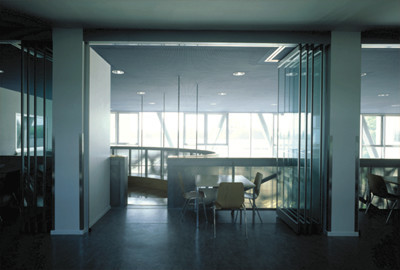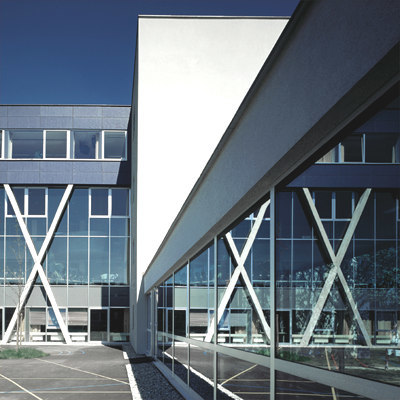 Die (energiesparende) Fassade aus grauen Eternitplatten korrespondiert mit dem sachlichen Geist des Bauwerks, drei x-förmige Stahlbetonstützen, die den Musiksaal im Obergeschoss tragen, sind in der Fassade des Zubaus von der gläsernen Gebäudehülle deutlich abgesetzt, sodass sich die Halle zur Umgebung schwellenfrei öffnet. (Text: Gabriele Kaiser)
