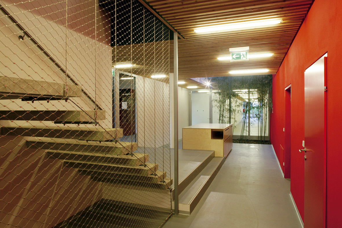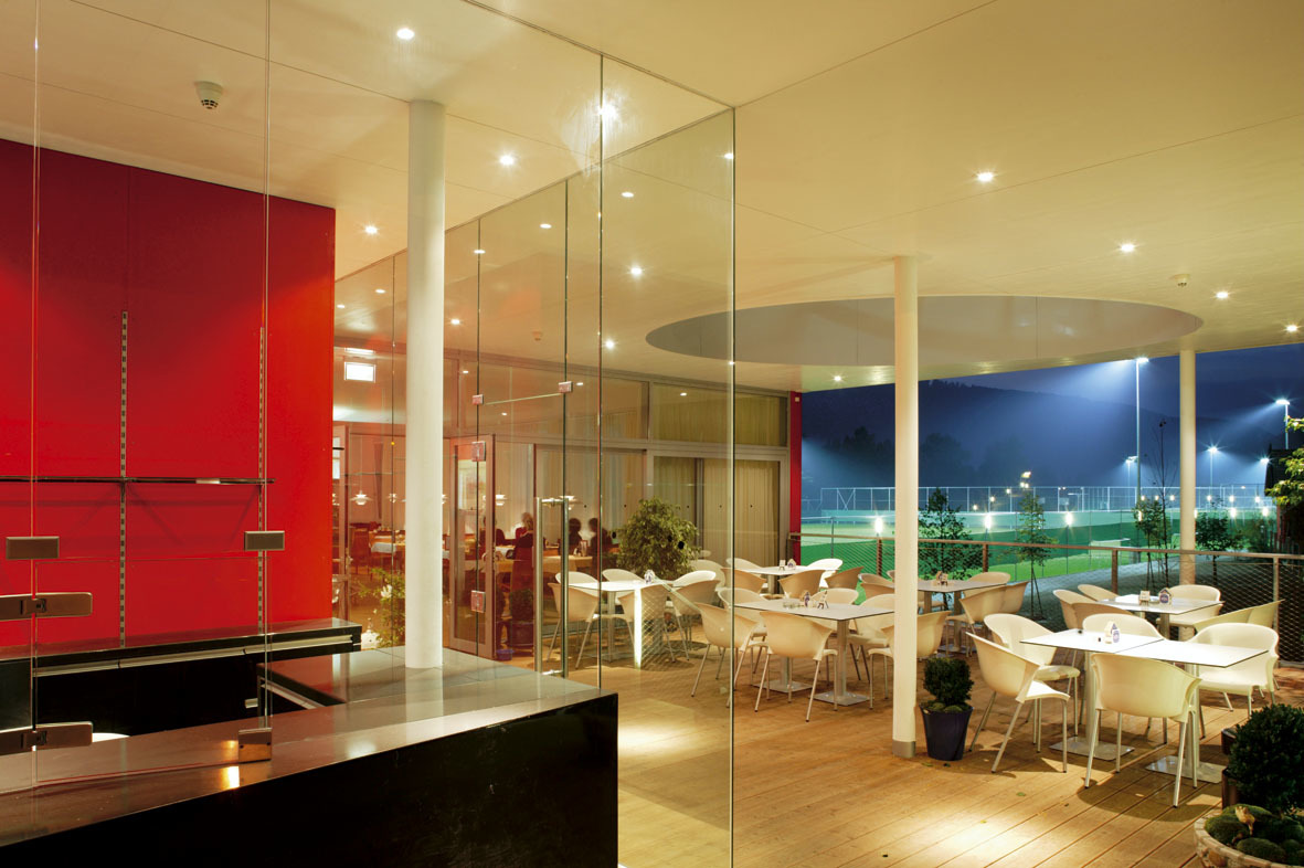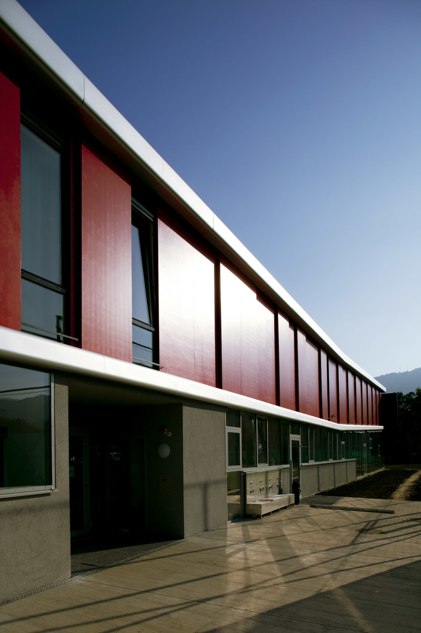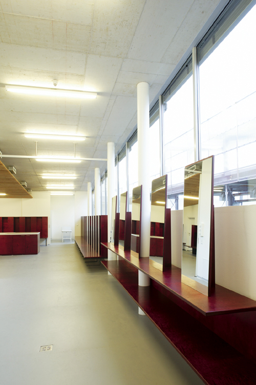 Erschlossen wird der Trakt intern bzw. von Nordosten, um die Wege von Besuchern und Spielern zu entflechten. Das Obergeschoss wurde aus Holzsystembauelementen in Niedrigenergiebauweise errichtet, Dreischichttafeln im roten Farbton des Klubs verkleiden den Baukörper bzw. dienen als Schiebeläden der Beschattung. Eine lange Rampe führt die Besucher von Südwesten her nach oben, wo sich Kasse und Tribünenzugänge befinden. Im südlichen Teil des Obergeschosses sind die Zimmer der Profis untergebracht, im nördlichen befinden sich Verwaltung, Sanitäreinheiten, Küche und ein Restaurant mit Terrasse und Blick auf das Spielfeld der Profis. Im Sinne der funktionellen Effizienz versorgt die Küche sowohl den Restaurant- als auch den Spielbetrieb und den Speisesaal der Profifußballer, wobei letzterer als Seminarraum und Erweiterung des Restaurants genutzt werden kann. Ein kleiner Lichthof zwischen Restaurant und „Spielerhomes“ stellt eine wichtige Sichtbeziehung in die Spielerbereiche beider Geschosse her und bringt Helligkeit ins Zentrum des Gebäudes. (Text: Architekten)