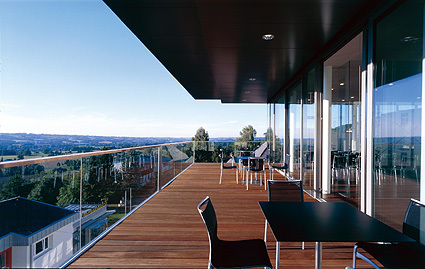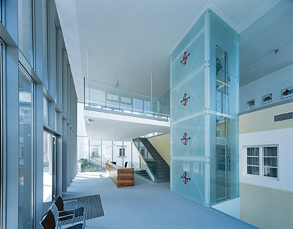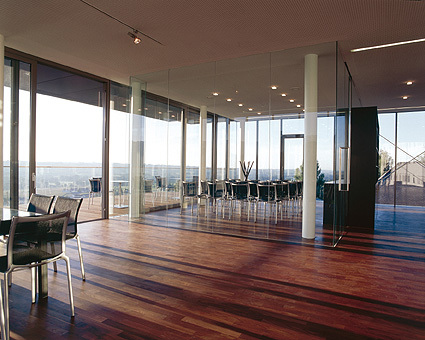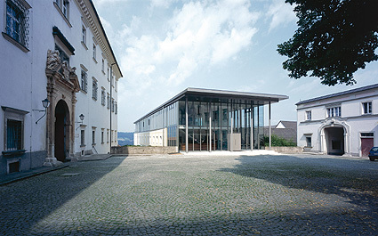 Die Aufstockung sowie die Eingangshalle wurden als leichter Stahl-Glasbau auf den historischen Bestand aufgesetzt. Durch die Transparenz der Gebäudehülle werden die gewaltigen Baumassen des Stiftes sowie das gesamte Alpenvorland eindringlich spürbar. Weite, auskragende Dächer beschirmen die Besucher Säulen gestützt vor dem Gebäude sowie in einer großzügigen Geste im Bereich der Dachterrasse.