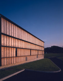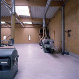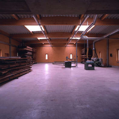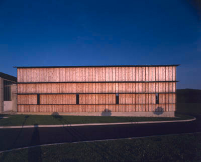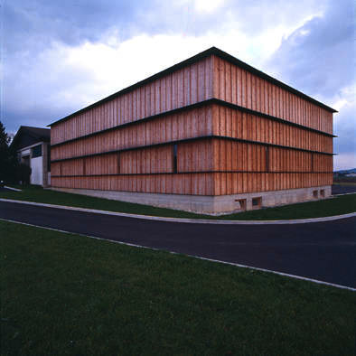 Leimbinder aus Fichte mit darüberliegendem Trapezblech bilden den oberen Abschluß. Belichtet wird die Halle von oben durch aufgesetzte „Lichtboxen“. Fensterschlitze in der Fassade stellen den Bezug zum Außenraum her.