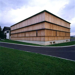 Die Bezeichnung „Massivholzhalle“ ist im doppelten Sinn zu verstehen; einerseits bezieht sie sich auf den Inhalt, andererseits auf die Oberfläche des Baukörpers. Der monolithische Charakter der „Massivholzhalle“ und die sorgfältig geplanten und ausgeführten Details sind Zeichen und Werbeträger für den Tischlereibetrieb. (Text: Architekt)