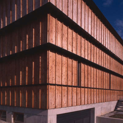 Die Fassade aus unbehandelten 3-Schichtfassadenplatten aus Lärchenholz wird als Hülle dreiseitig um den Baukörper „gewickelt“. Aufgeschraubte Massivholzleisten geben der Oberfläche Struktur und Textur. Gekantete Stahlbleche gliedern die Fassade in der Höhe und sind gleichzeitig konstruktiver Holzschutz.