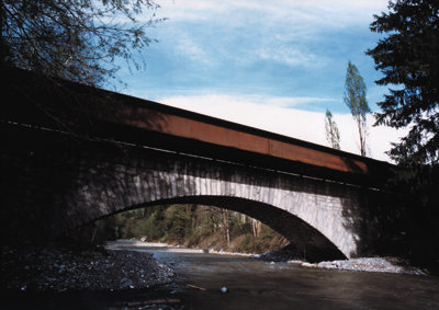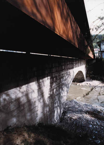 Die vertikale Platte des Stahlwinkels dient talseitig zugleich als Brüstung. Aussteifungen an den betonierten Widerlagern geben dem Tragwerk einen massiven Abschluss. Verschiedene Umbauten an der alten Brücke wurden bereinigt und das bergseitige Brückengeländer neu als Steinmauer ausgeführt.