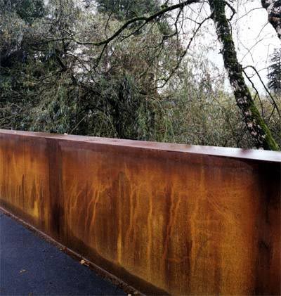 Ein 40 m langer und 40t schwerer Stahlkörper begleitet nun die Steinbrücke, geformt als großes Z-Profil aus 30mm Corten-Stahlblech, das nur an wenigen Punkten am alten Steinkörper auflagert und dieneue Spur etwas von der alten Fahrbahn abhebt. So bleibt die ganze Höhe der Steinbrücke optisch erhalten, ein Lichtschlitz wirkt als klare Fuge zwischen Alt und Neu.