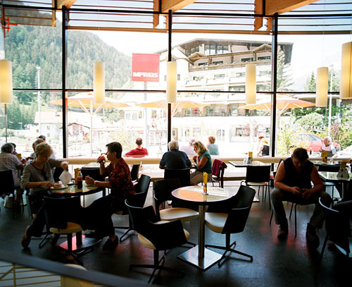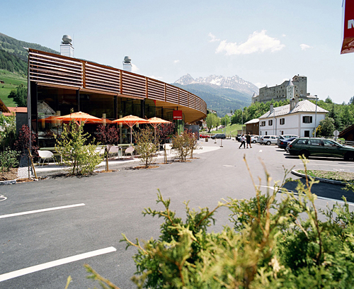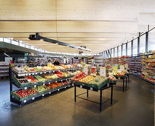 Zwei Zonen, auch außen über die Ausformung des Daches ablesbar, gliedern den Innenraum. Während im hohen zweiseitig großzügig belichteten Hauptraum die Ware auf Regalen präsentiert wird, befinden sich spezielle tageslichtempfindliche Zonen in einem niedrigeren und geschlossenen Bauteil. Zum Großteil im Hang eingebettet bietet der im Osten des Grundstücks situierte Bereich der Feinkosttheke und den Kühlregalen mit Molkereiprodukten und Frischfleisch Räume ohne direkte Belichtung. In diesem introvertierten Rückgrat des Gebäudes bildet der dunkle Fußboden mit der Wand und der Decke eine materielle und farbliche Einheit und bringt die mit einer speziellen Beleuchtung ausgestattete Frischware verstärkt zur Geltung. Massiv in Beton ausgeführt, wurde der „Rücken“ innen gedämmt und außen in grob ausgewaschenem Sichtbeton belassen, während der Licht durchflutete Hauptraum in Leichtbauweise mit sichtbarer, in Trägermitte verstärkter Holzkonstruktion ausgeführt wurde. (Text: Architekten)