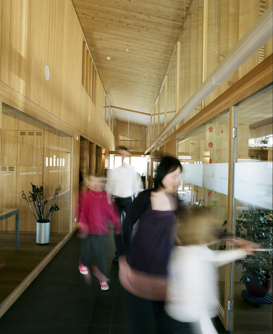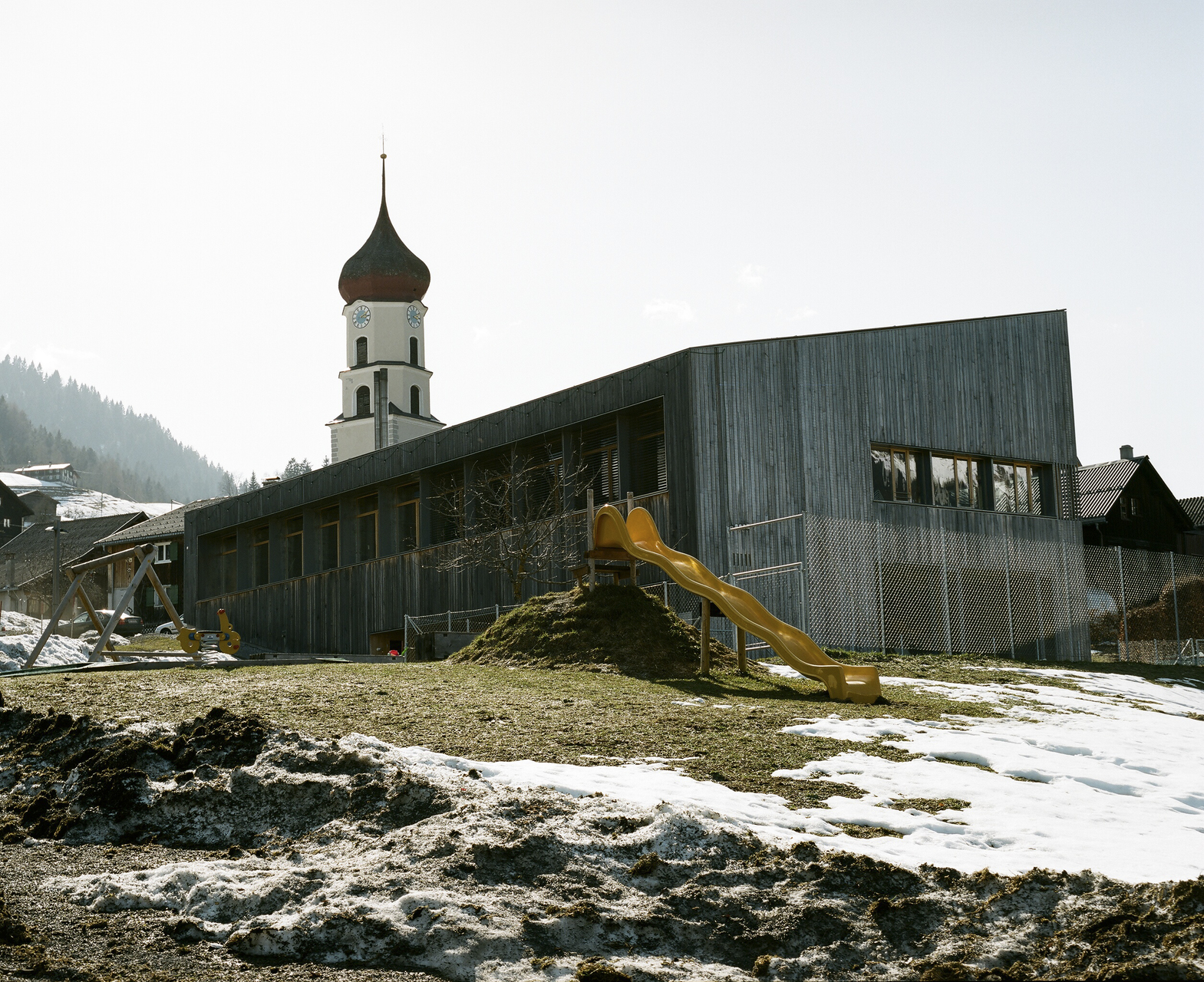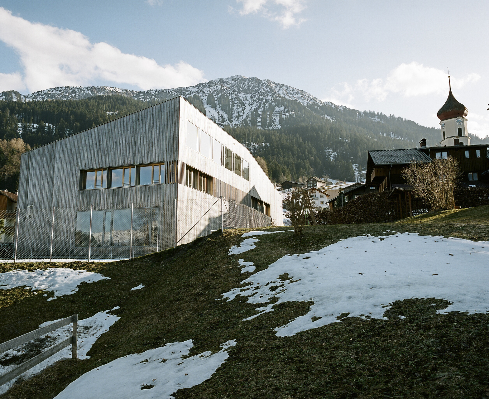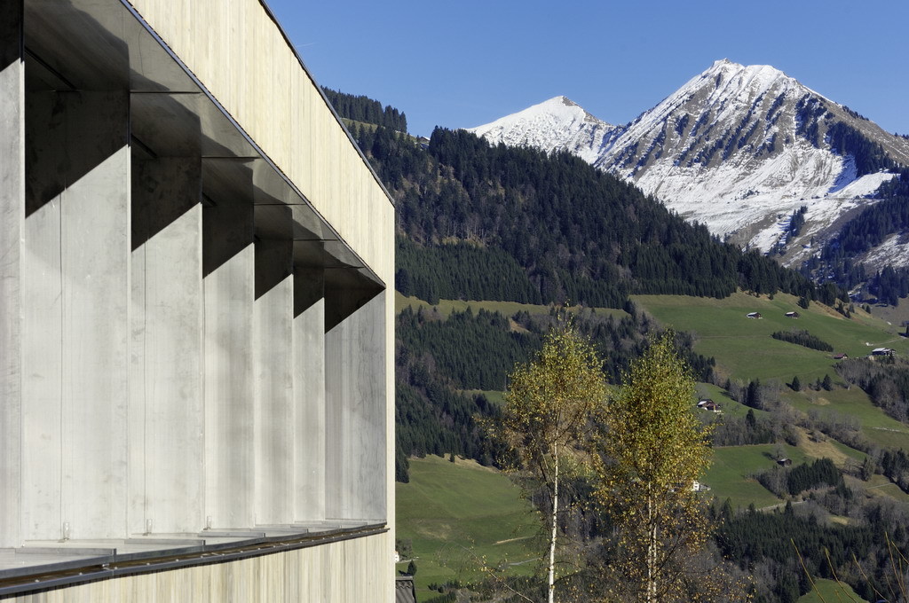 Nicht immer ist es in Raggal so neblig wie an diesem grauen, kühlen Oktobertag. Der leichte Nieselregen lässt das Bergdorf verschlafen wirken, kaum ein Bewohner oder Besucher ist am Nachmittag auf den Straßen unterwegs. Normalerweise eröffnet sich vom Dorfplatz aus, in dessen Mitte eine alte Linde auf 1050 Metern Höhe thront, ein schöner Blick auf das Walsertal und die gegenüberliegende Hangseite mit ihren kleinen Dörfern. Heute aber hängen dicke Nebelwolken über dem Tal und versperren jegliche Sicht. Die gelungene Einfügung des neuen Gemeindehauses in den Ortskern, gleich neben dem Dorfplatz mit Kirche und Schulhaus, wird so nur zum Teil deutlich. Denn als Einziger schlug Johannes Kaufmann beim vorangegangenen Wettbewerb für das neue Gemeindehaus ein eher lang gestrecktes, flaches, nur zweieinhalbgeschossiges Gebäude vor, das den Blick in das Walsertal und umgekehrt nicht blockiert. Keinen »Turm« wie seine Wettbewerbskonkurrenten, erklärt er – selbst noch immer etwas erstaunt über die Tatsache, dass die Entwürfe seiner Kollegen diesen Panoramablick wesentlich gestört hätten. Auf der Eingangsebene hat er alle wichtigen Funktionen verteilt: das Tourismusbüro, Räume der Gemeindeverwaltung, Bürgermeisterzimmer oder das »Walserstüble«, eine Küche für die Eltern-Kind-Beratung. Im Obergeschoss befinden sich nur das Sitzungszimmer und ein Archiv, im Untergeschoss, in den Hang eingeschoben, Technikräume und ein Musikprobensaal für den Musikverein.
