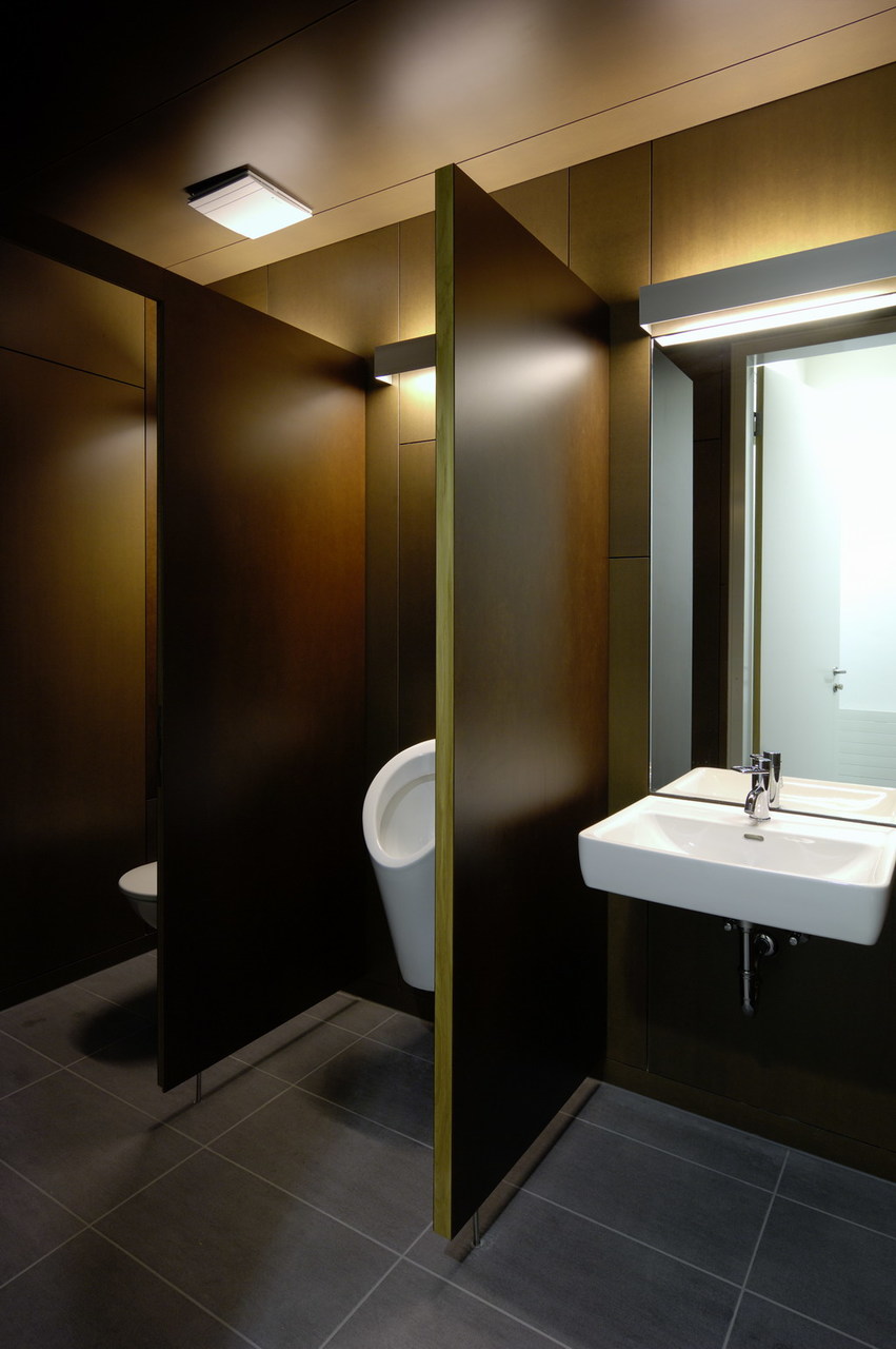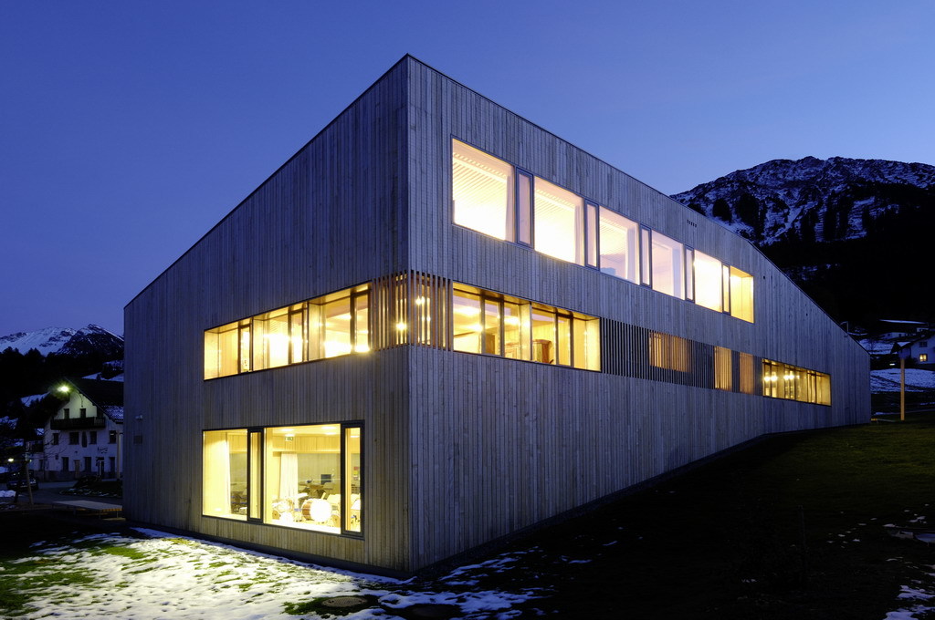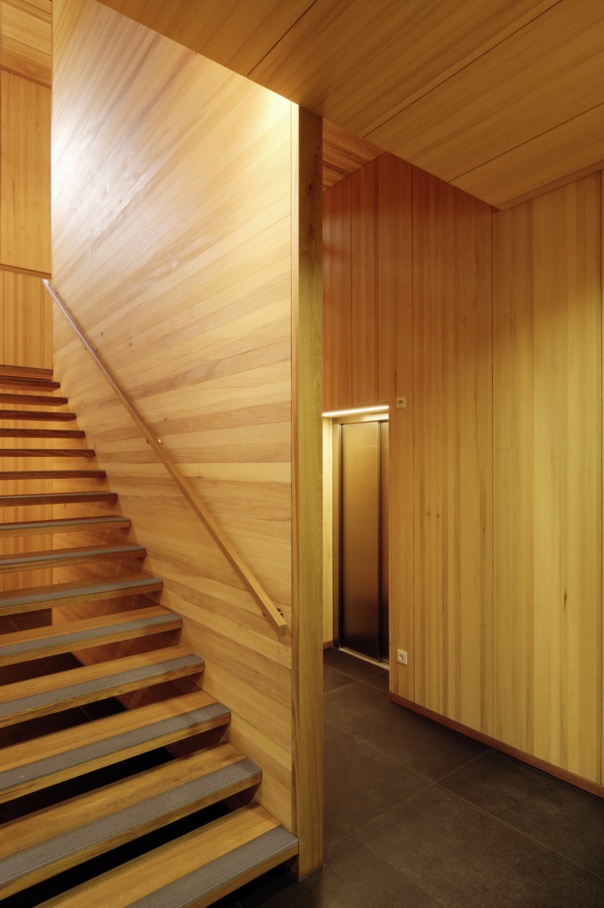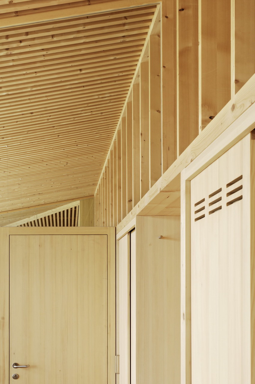 Vom Planungsbeginn im Juli 2005 bis zur Fertigstellung des Gemeindehauses verging gerade mal ein gutes Jahr. Den einstufigen Architekturwettbewerb lobte die kleine Gemeinde Raggal mit ihren knapp 900 Einwohnern Anfang 2005 aus. Sechs Vorarlberger Büros, die sie sich als Planer ihres neuen Gemeindehauses vorstellen konnten, luden sie hierzu ein, darunter auch das Büro von Johannes Kaufmanns Bruder Hermann Kaufmann, der rund ein Jahr zuvor bereits im benachbarten Ludesch ein Gemeindehaus in Passivbauweise erstellt hatte. Für den Neubau war die Verwendung heimischen Holzes gewünscht, da die Gemeinde über eigenen Wald verfügt und Mitglied im »Biosphärenpark Großes Walsertal« ist. Diese von der UNESCO ausgezeichneten Biosphärenreservate gibt es weltweit fast 500 Mal, jeweils für Regionen mit nachhaltiger Wirtschafts- und Lebensweise. Wichtig war daher auch, in Anlehnung an den Gedanken der regionalen Wertschöpfung, dass für den Neubau Materialien aus dem Walsertal verwendet und Firmen aus der Region beauftragt wurden. Den Wunsch der Kommune nach der Verwendung von Holz hat Johannes Kaufmann als gelernter Zimmermann nur allzu gern erfüllt. Der zukünftige Energieverbrauch war seitens des Bauherrn zwar nicht auf exakte Zahlen festgelegt, dennoch schlug Kaufmann bereits im Wettbewerb ein Niedrigenergiehaus mit Passivhauskomponenten vor – ein Standard, der für ihn und viele seiner Vorarlberger Kollegen längst selbstverständlich ist. Die Baukosten konnte er weitgehend einhalten, eine Überschreitung gab es durch die hinzugekommene Biomasse-Heizanlage, mit der über eine Nahwärmeleitung weitere benachbarte Gebäude mit Heizenergie versorgt werden können. Als Brennstoff dient vorwiegend Waldhackgut aus der eigenen Gemeinde. Im Musikprobensaal im Untergeschoss, den die Musiker ebenerdig und separat von der Hangseite erschließen können, wurde aus Kostengründen vieles in Eigenleistung von der Gemeinde erbracht. Dass man das dem Raum nicht ansieht, verweist auf die handwerklichen Fähigkeiten im Ort. Neben der Außenhülle aus Weißtanne wurde auch im Inneren konsequent der heimische Baustoff verwendet. Fast schon ein bisschen zu viel, mag man im ersten Moment denken, wenngleich der frische, kernige Geruch beim Eintreten diesen Gedanken sogleich vertreibt. Die bis auf Fußböden, Tische und Toiletten nahezu komplette Ausstattung mit Holz – Weißtanne vorwiegend als Beplankung, Fichte für die Konstruktion des Stabtragwerks –, passt in die ländliche Umgebung und vermittelt zwischen traditioneller Bauweise und eher nüchternem Architekturstil. In dem dicken Wandaufbau aus Hohlkastenprofilen und 32 Zentimeter Dämmung sitzen großzügige Fensteröffnungen. Johannes Kaufmann hat nicht auf »Biegen und Berechnen« ein Passivhaus gebaut – wohl aber bewusst all die Komponenten eingesetzt, die einen geringen Wärmeverbrauch ermöglichen und gleichzeitig architektonisch vertretbar waren. Neben moderner Haustechnik mit einer kontrollierten Be- und Entlüftung mit Wärmerückgewinnung oder den dreifachverglasten Fenstern hat er vor allem eine kompakte Außenhülle geschaffen, die – wohlbemerkt auch nach Norden hin – der Aussicht ins Tal wegen großzügige Fensteröffnungen besitzt.