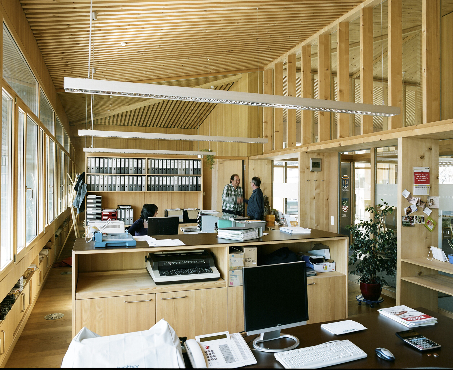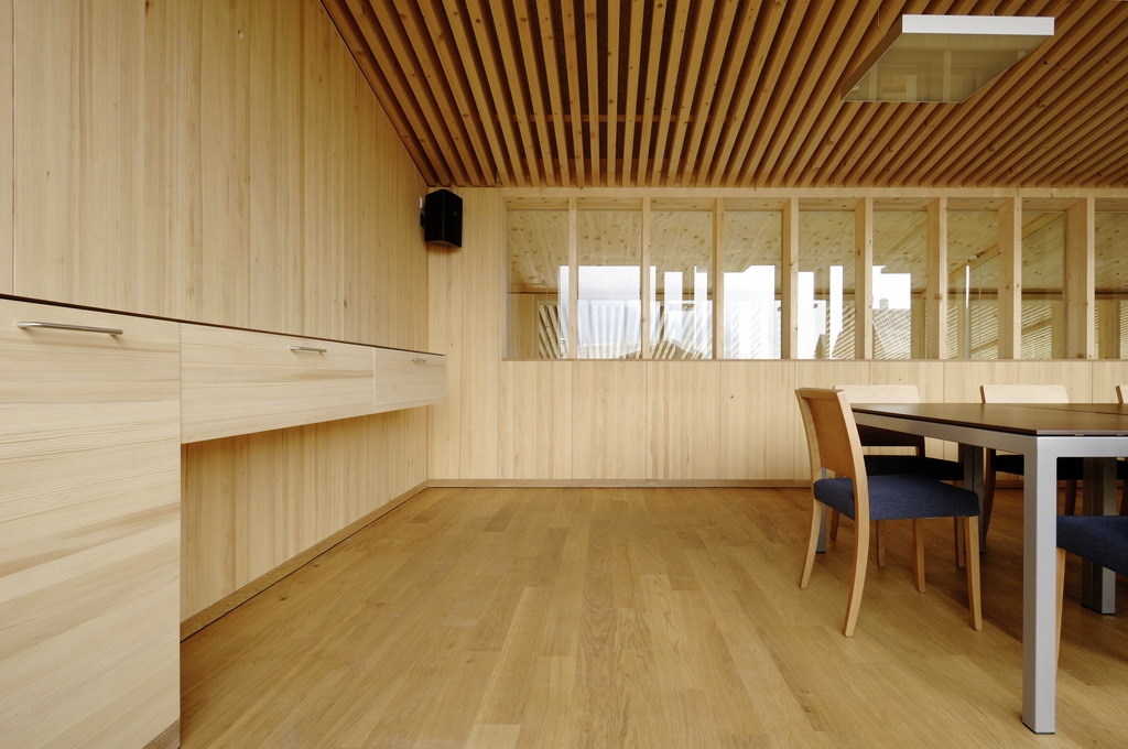 Kaufmann ist zufrieden mit dem Gemeindehaus und dem Bauablauf. Etwa zehn Mal traf er sich während der Vorbereitungsszeit mit dem Bauherrenteam zu gemeinsamen Sitzungen. Gerade dieses Projekt bedeutet ihm persönlich besonders viel: Zum einen stammt er aus einer ebenso kleinen Gemeinde mit ähnlicher Dorfstruktur, verstand somit die Bedürfnisse der Bewohner und war sich der seltenen Chance bewusst, »an einem so schönen Ort zu bauen«. Zum anderen gefiel ihm besonders der direkte Umgang mit Holz und die Möglichkeit, sein Wissen als gelernter Zimmerer einsetzen zu können. Denn die Verwendung heimischen Holzes bedeutete auch, eine Holzschnittliste zu erarbeiten, damit das entsprechend gefällte Holz noch rechtzeitig trocknen konnte und pünktlich zum Baubeginn vorlag. Kaum war der Wettbewerb abgeschlossen und noch bevor das Tragwerk mit dem Tragwerksplaner abgestimmt war, wurden im eigenen Gemeindewald nach seiner Schnittliste Hölzer mit einem Querschnitt von 7 cm gesägt, die später einheitlich auf 6 cm-Querschnitte gehobelt wurden. Ein Wagnis für jeden Planer, sich so frühzeitig festzulegen, und auch nur für einen Zimmermann wirklich kalkulierbar. Auch von Bauherrenseite gibt es nichts zu beanstanden. Der Bürgermeister hatte gerade seine Amtszeit begonnen, als die Planungs- und Bauzeit startete. Stolz führt er durch die neuen Räume und lobt die gute Zusammenarbeit. Obwohl ein paar wenige gestalterische Unstimmigkeiten zwischen Planer und Gemeinde auftraten, beispielsweise was die Wahl des Fußbodenbelags anbelangte, wirkt nichts wie eine Kompromisslösung. Lediglich in der Detailausführung hätte man das eine oder andere noch optimieren können, etwa was Steckdosen, Kabelführung oder die Möblierung betrifft. Aber es muss nicht alles zu »designt« sein, erklärt Kaufmann. Die Stühle stammen teilweise aus den alten Gemeinderäumen, so dass es verständlich ist, wenn diese – wiederum im Sinne ökologischen Verhaltens – nicht einfach auf dem Sperrmüll landeten. Die Schuld daran, dass das Berufsbild des Architekten, vor allem außerhalb Vorarlbergs, in den letzten Jahrzehnten gelitten hat, sieht Kaufmann auch in dem Verhalten der Architekten selbst. Etwa, wenn sie zu gewagte, teure Details vorschlagen, die nicht funktionieren, und sich brüskiert fühlen, wenn ihre Vorschläge nicht angenommen werden. Er sieht sich und seine Mitarbeiter – ein Büro mit rund 15 Angestellten, das sich neben Dornbirn auch gerade in Wien niederlässt –, besonders »nah am Kunden«, für die er gute, vor allem aber nutzbare Architektur plant.