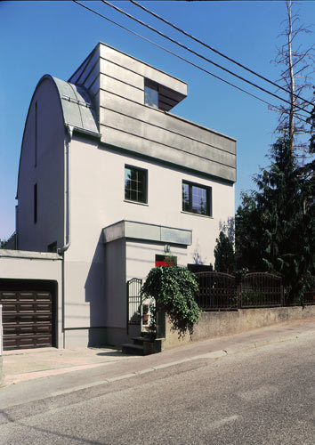 Durch die Hanglage hat auch das Untergeschoß mit Gästezimmer und Sauna einen Zugang zum Garten. Das Grundstück liegt in Hörweite der in Stoßzeiten stark befahrenen Hüttelbergstraße. Der Lärmimmission wurde durch planerische und bautechnische Maßnahmen entgegengewirkt. Die Dachterrasse wurde aus diesen Gründen nach Osten orientiert, eine kontrollierte Wohnraumlüftung schafft Wohlbehagen bei geringer Lärmbelästigung. (Text: Architekt)