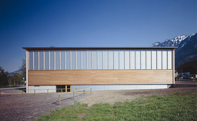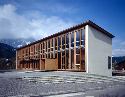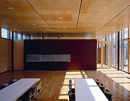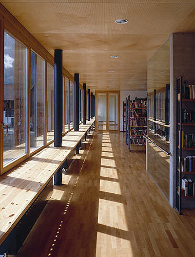 Der Saal im Erdgeschoss ist NW bis auf ein Oberlichtband geschlossen; Bibliothek und Musikraum darüber; Jugendräume darunter mit Zugang und Belichtung von der abgesenkten Nordwestseite. (Text: Otto Kapfinger in „Baukunst in Vorarlberg seit 1980, Hrsg. VAI / KUB“)