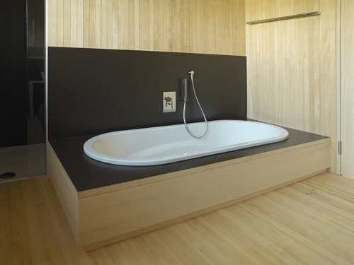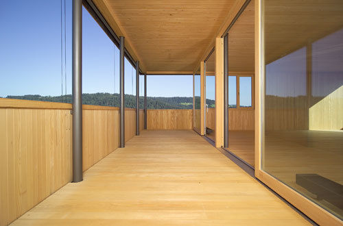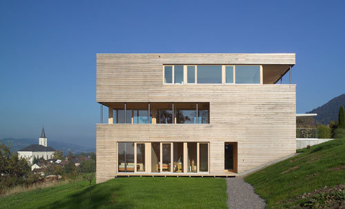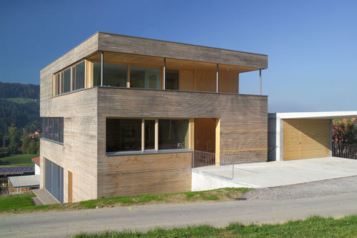 Wände und Decken sind aus 14cm Massivdübelholz in vorgefertigter Bauweise ausgeführt. Diese bestehen aus mit Holzdübeln verpressten, 5cm breiten Holzlamellen, die in den Sichtflächen astfrei und mit feiner Schattennut gefertigt sind. Ein vorgefertigter Fischbauchträger, der über die gesamte Breite des Gebäudes gespannt ist, bildet die Dachkonstruktion. Die Außenfassade besteht aus einer hinterlüfteten, sägerau geschnittenen Rhombusschalung. Der gesamte Ausbau, wie Fenster, Türen, Böden und Stiegen erfolgte analog zur Massivholzkonstruktion aus Weißtannenholz. Die Oberflächen der Fenster, Holzböden und Stiegen sind geölt, die Wand und Deckenoberflächen sind gehobelt und Natur belassen. Durch das helle und astfreie Weißtannenholz wird den Innenräumen ein feines und elegantes Erscheinungsbild fernab jeglicher Rustikalität gegeben.