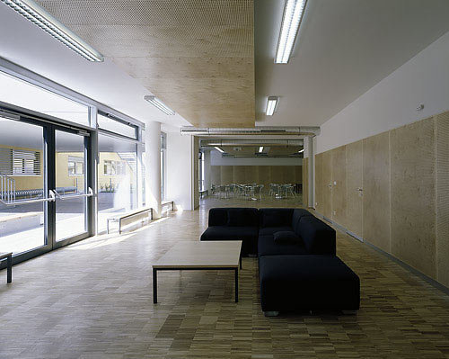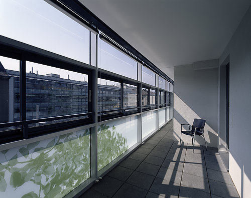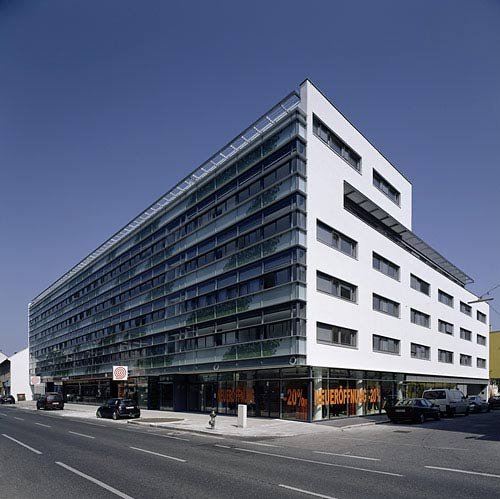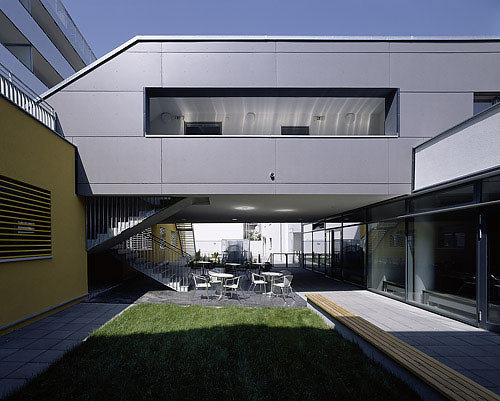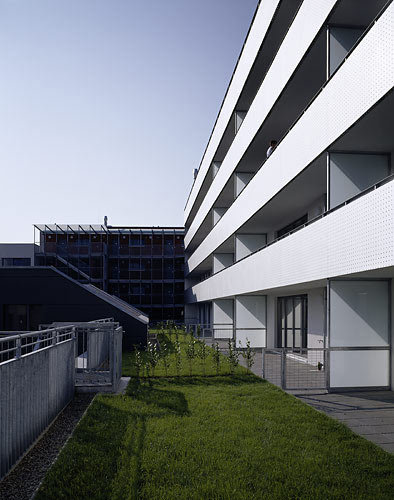 Sonnenschutzlamellen lassen die zurückgesetzte Dachzone himmelwärts gleiten. Die pergolagedeckte Terrasse mit Panoramablick über kleinteilige Hinterhaus- und Hoflandschaften bis hin zu den Gasometern und zum Millennium - Tower gehört gleichermaßen Bewohnern und Studenten. Nach allen Regeln der Kunst feiert der zentrale Innenhof mit der langen, grünen Terrasse im ersten Stock die studentische Gemeinschaft.