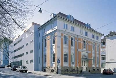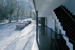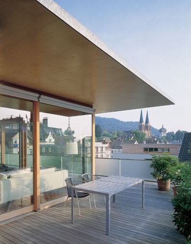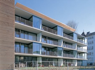 Die Wohnungen sind völlig zur Hof- und Südwestseite orientiert, haben dort durchgehende Glasfronten mit vorgelagerten Balkonen, rhythmisiert durch Loggien im 1. und 3. Obergeschoss. Das Penthouse gliedert sich in die massive, verschalte Schlafbox, den dreiseitig transparenten Wohnteil und ein auskragendes Flachdach aus Holz-Hohlkastenelementen. (Text: Otto Kapfinger in „Baukunst in Vorarlberg seit 1980, Hrsg. VAI / KUB“)