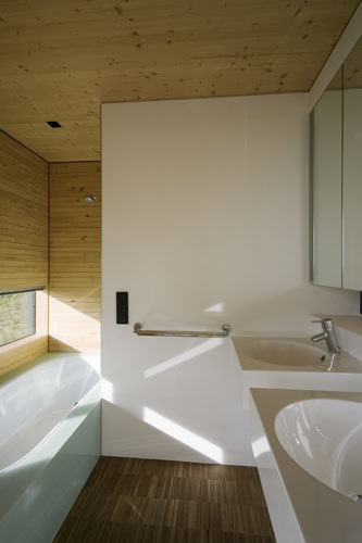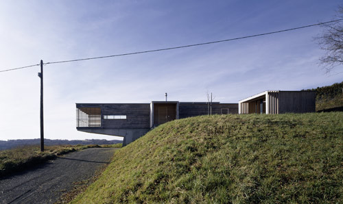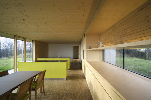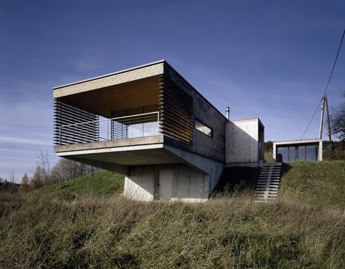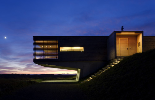 Aufbauzeit des gesamten Holzbaues, inklusive der Glaselemente, sowie der Dachabdichtung: 9 Tage. Alle Holzteile sind außen wie innen sichtbar belassen, der Kontrast der „warmen“ Holzhülle zur „kalten“ technischen Glasfassade verleiht den Räumen Spannung und fokussiert den Blick auf die unterhalb des Hauses liegende Hügellandschaft. Die komplette Außenhülle wurde mittels Nano-Technologie vor Verwitterung geschützt. Durch diese Veredelung der Holzoberfläche im Nano-Bereich wird Wasser abgestoßen, Pilzbefall verhindert und der Prozess des Vergrauens