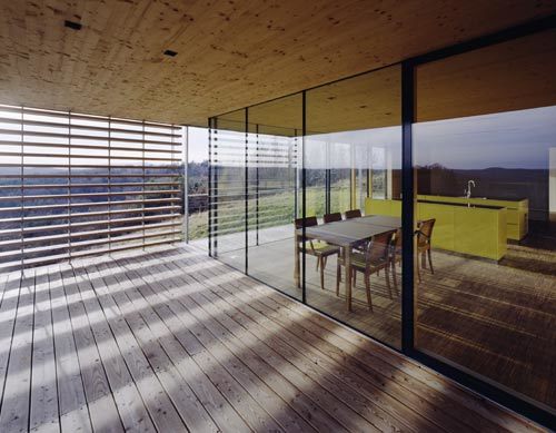 schmalen Stockkonstruktionen mit den filigranen Fixverglasungsteilen harmonieren. Die Glasdrehtüren sind teilweise mit speziellen 180°-Bändern versehen, und können im Sommer in geöffneter Stellung fixiert werden. Die Glasflächen werden südseitig von einem großzügigem Vordach abgeschattet. (Text: Architekt)