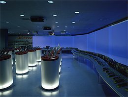 Alle Baukörper und Flächen sind dem hereintretenden Besucher zugeneigt. Ist die Fläche nicht schräggestellt, so sind es die Produkte, die sich auf schräggestellten Halterungen präsentieren. Auch die Elemente der Kassapulte sind geneigte Quader. Sie scheinen über dem Boden zu schweben. Verstärkt wird dieser Effekt noch durch blaues Neonlicht, das aus dem Inneren der Quader aus dem Bodenschlitz strahlt. Die Kassapulte antworten in Form und Stellung auf die gegenüberliegende sich entlangschlängelnde Präsentationsfläche. Sie sind in MDF lackiertem Grau gestaltet. Ein raumhoher Wandverbau dahinter - in gleicher Weise ausgestattet wie die Pulte - arbeitet mit Elementen wie Vitrinen, semitransparenten Schiebegläsern und Drehflügeltüren.