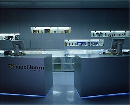 In der Mitte des Verkaufsraumes stehen zwölf leuchtende schräggestellte Präsentationszylinder, auf denen Mobiltelephone angeboten werden. Vor der zwei Wände umfassenden Videowand läuft eine ca. 80 cm hohe leicht schräggestellte Fläche, die sich von der Videowand etwas abgerückt entlangschlängelt. Hier werden technische Accesoires präsentiert.