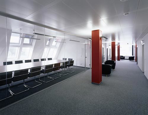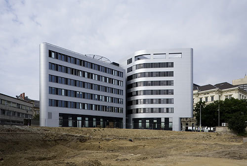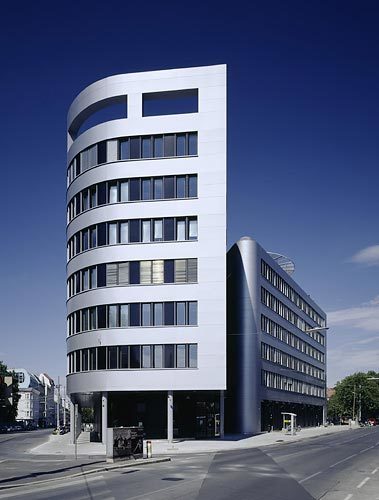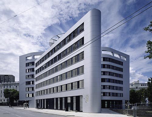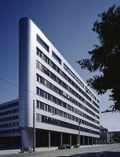 Diese Ziele verlangten nach einer eigenen Formensprache und einer Ästhetik der Optimierung: Die freistehende Situation ermöglicht und fördert die allseitige Erfahrung des Objektes. Damit ist eine vielfältige Erscheinung einer Oberfläche - einer Fassade - fast selbstverständlich vorgegeben. Diese Oberfläche fließt ohne Brüche und Kanten um das Volumen und lässt den Zwischenraum mit der Erschließung entstehen: das Rückgrat des Objektes. Energieeffizienz wiederum verlangt nach einer optimalen Gebäudehülle, die nicht in sinnloser Transparenz endet. Hier ist eine intelligente Membran erforderlich, die gerade so viel Transparenz - und damit solaren Wärmeeintrag - zulässt wie das Gebäude verkraften kann.