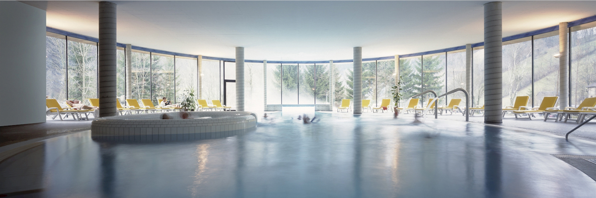 Über dem nahezu durchlässigen Erdgeschoss schwebt die Sauna- und Wellnesswelt, umhüllt mit natürlichem sägerauem Lärchenholz. Die durch Raum hohe Verglasungen erzielte Offenheit und Transparenz lässt einen starken Bezug zur reizvollen Landschaft des Bregenzerwaldes über die Jahreszeiten hinweg zu. Ruhebereiche ums Becken, einen Kaltwasserpool und ein Therapiebecken ergänzen die Badelandschaft. Gartenpool und Erlebnisbecken sind verbunden, baden im Garten wird ganzjährig zum Vergnügen.