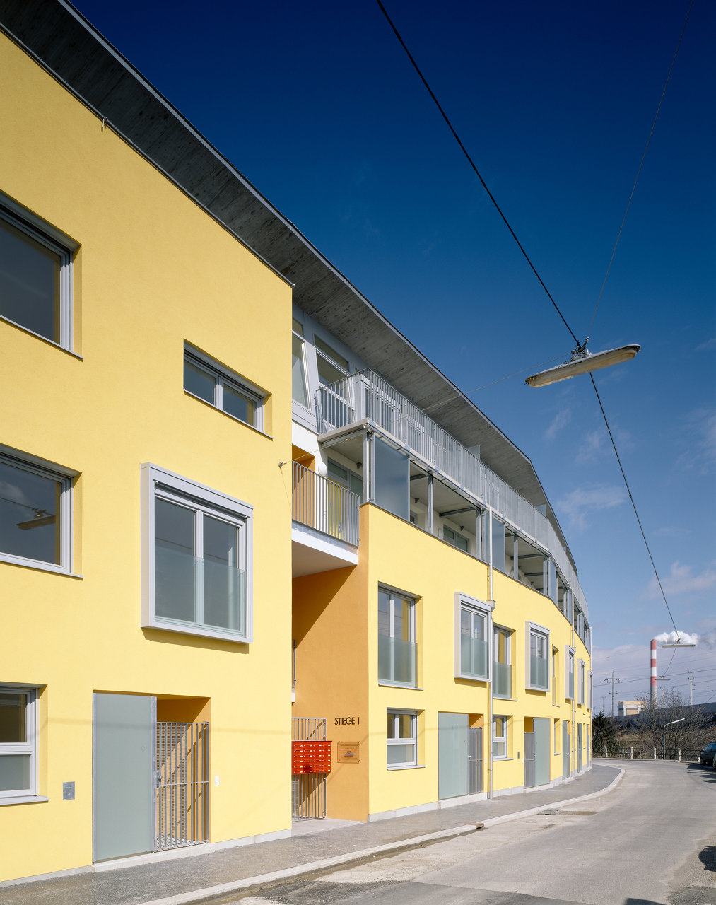 Jede der unteren Maisonetten hat ihre eigene Eingangszone und ihren eigenen Garten am Hof. Harmonisch geht die Zeile in die angrenzende Biedermeierbebauung über. Der offene Laubengang darüber bildet eine Zäsur zum leichten Abschluss des Hauses, auf dem windschützendes Strukturglas den gelben Türen ein Davor bietet. Der Baulinie folgend schmiegt sich das gelb verputzte Haus mit seinen tanzenden Fenstervariationen an die Straßenkurve. Subtil betonen die leicht unterschiedlich geneigten Fassadensegmente den individuellen Charakter jeder einzelnen Wohnung.