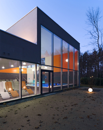 Der Wellnessbereich entwickelt sich im östlichen Teil des Gebäudes als differenzierte 1-2 geschoßige Raumfolge mit unterschiedlichen Raumerlebnissen. Großzügige Verglasungen geben dabei immer wieder den Blick in den anschließenden Hummelhofwald frei. Das Thema „Waldrand“ wird dabei aufgenommen, in den unterschiedlichen Blickbeziehungen zu und von den 2 Relaxbecken variiert und am nördlichen Ende des Bereiches durch das Verlassen des Raumes im Außenbecken erlebbar gemacht.